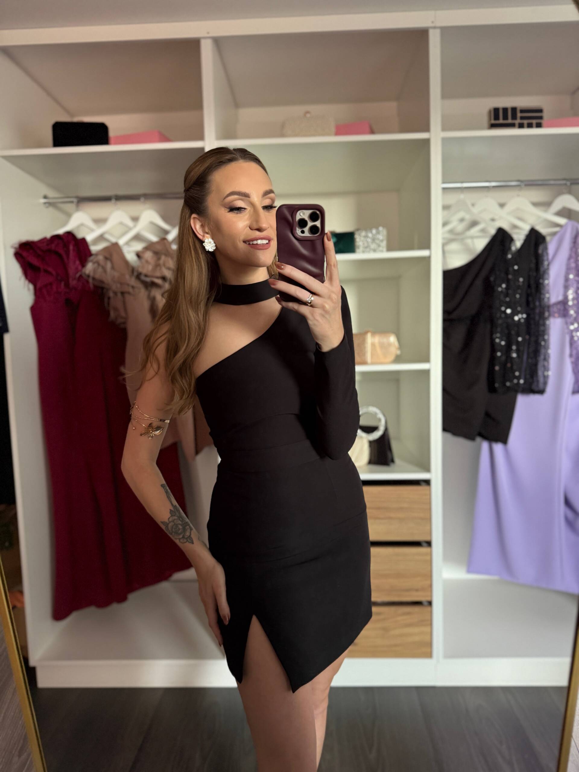 Minimalizm w najbardziej wyrafinowanym wydaniu. Czarna sukienka mini o asymetrycznej linii przyciąga uwagę nowoczesną formą i dopracowanymi proporcjami.