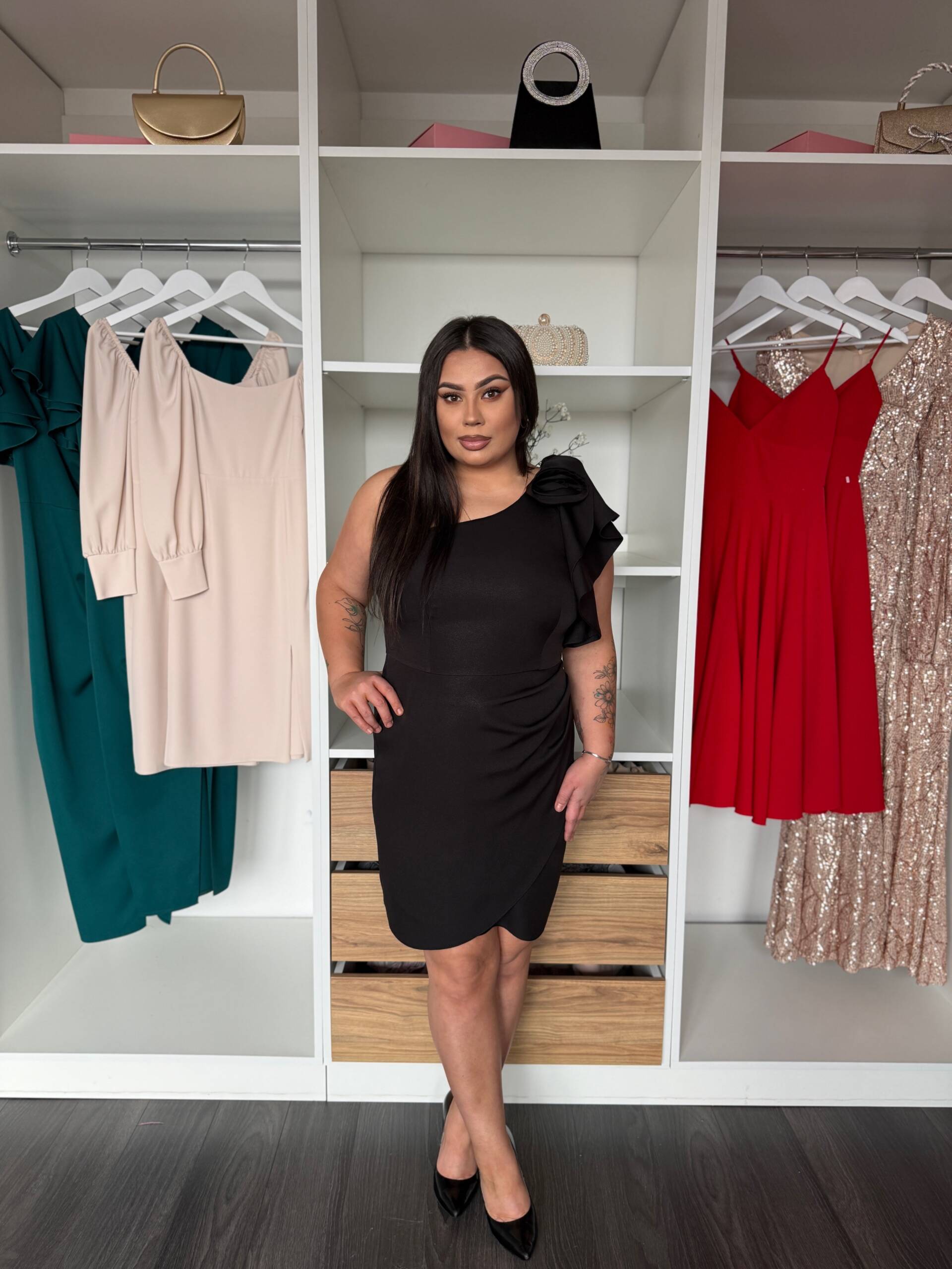Sukienka mini na jedno ramię z efektowną falbaną – klasyczna czerń w nowoczesnym wydaniu.