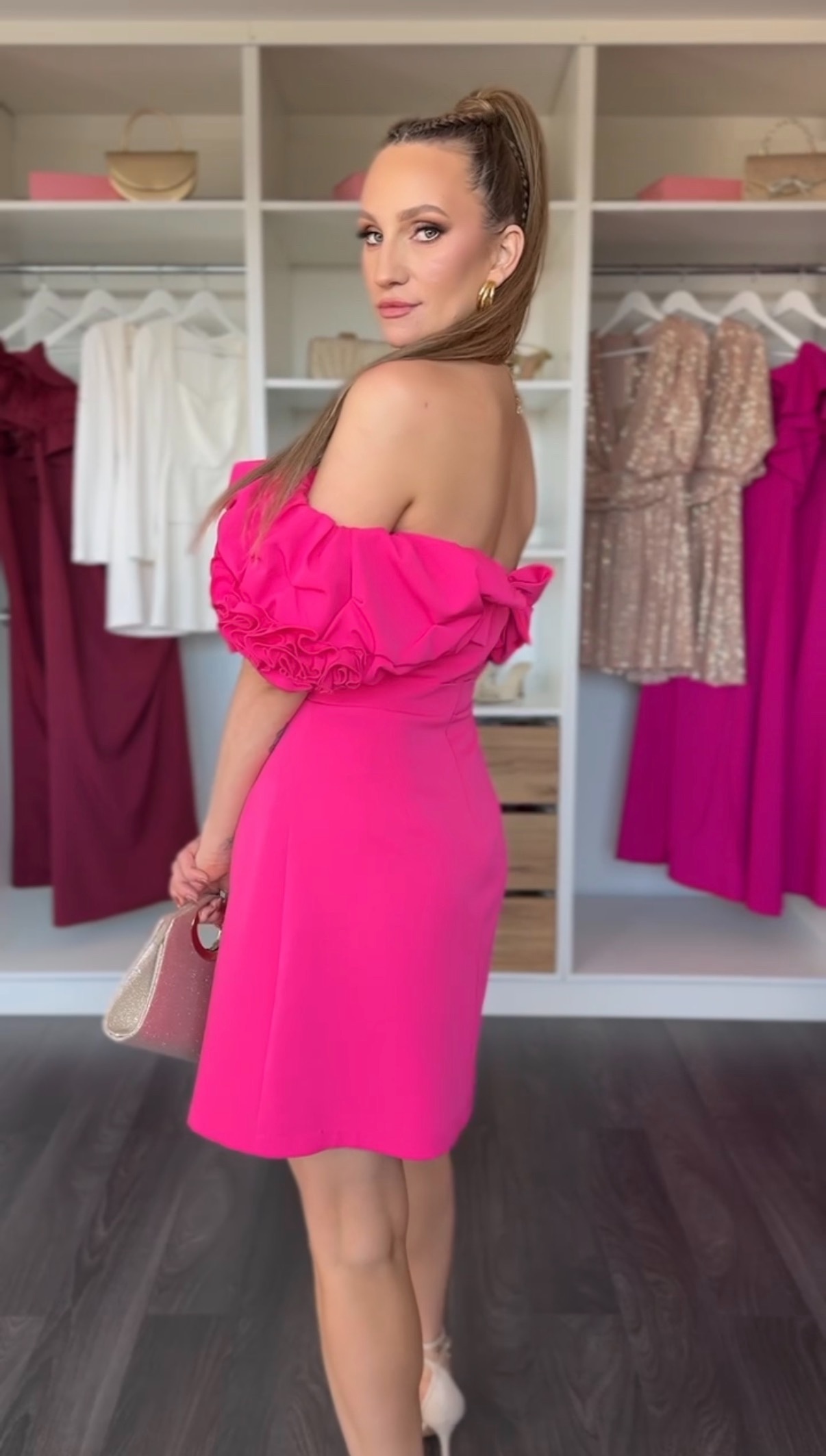 Krótka sukienka w intensywnym kolorze fuksji, która przyciąga spojrzenia i podkreśla kobiecą energię. Góra w stylu hiszpanki subtelnie odsłania ramiona, nadając stylizacji romantycznego, a jednocześnie zmysłowego charakteru.