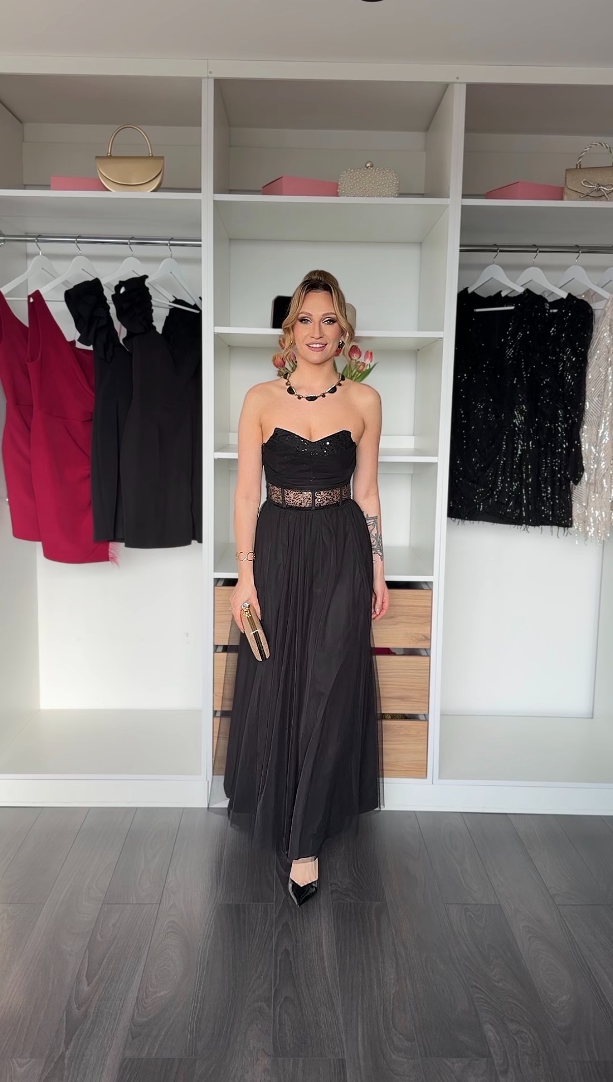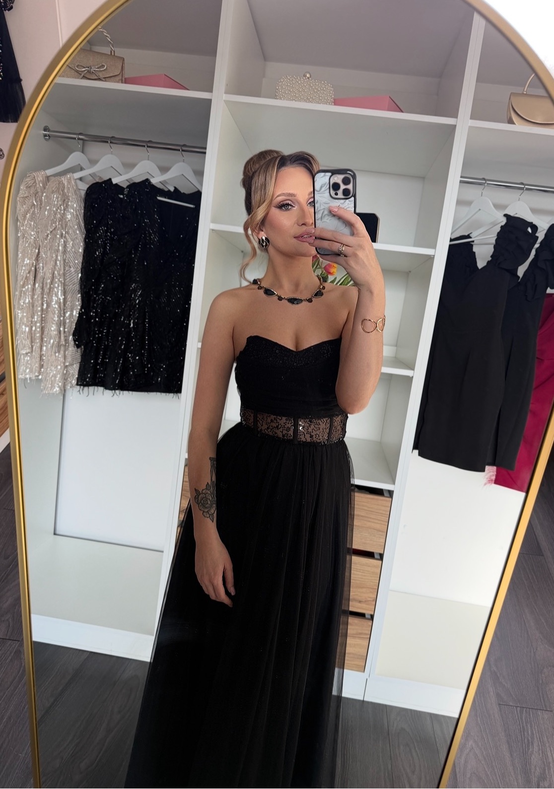Zjawiskowa suknia wieczorowa, która łączy klasyczną czerń z nowoczesnym sznytem. Usztywniany gorset z subtelnymi cekinami pięknie modeluje sylwetkę, a transparentny pas w talii optycznie ją wyszczupla. Dół sukni wykonany z wielu warstw lekkiego tiulu nadaje kreacji lekkości i wyjątkowo prezentuje się w ruchu.