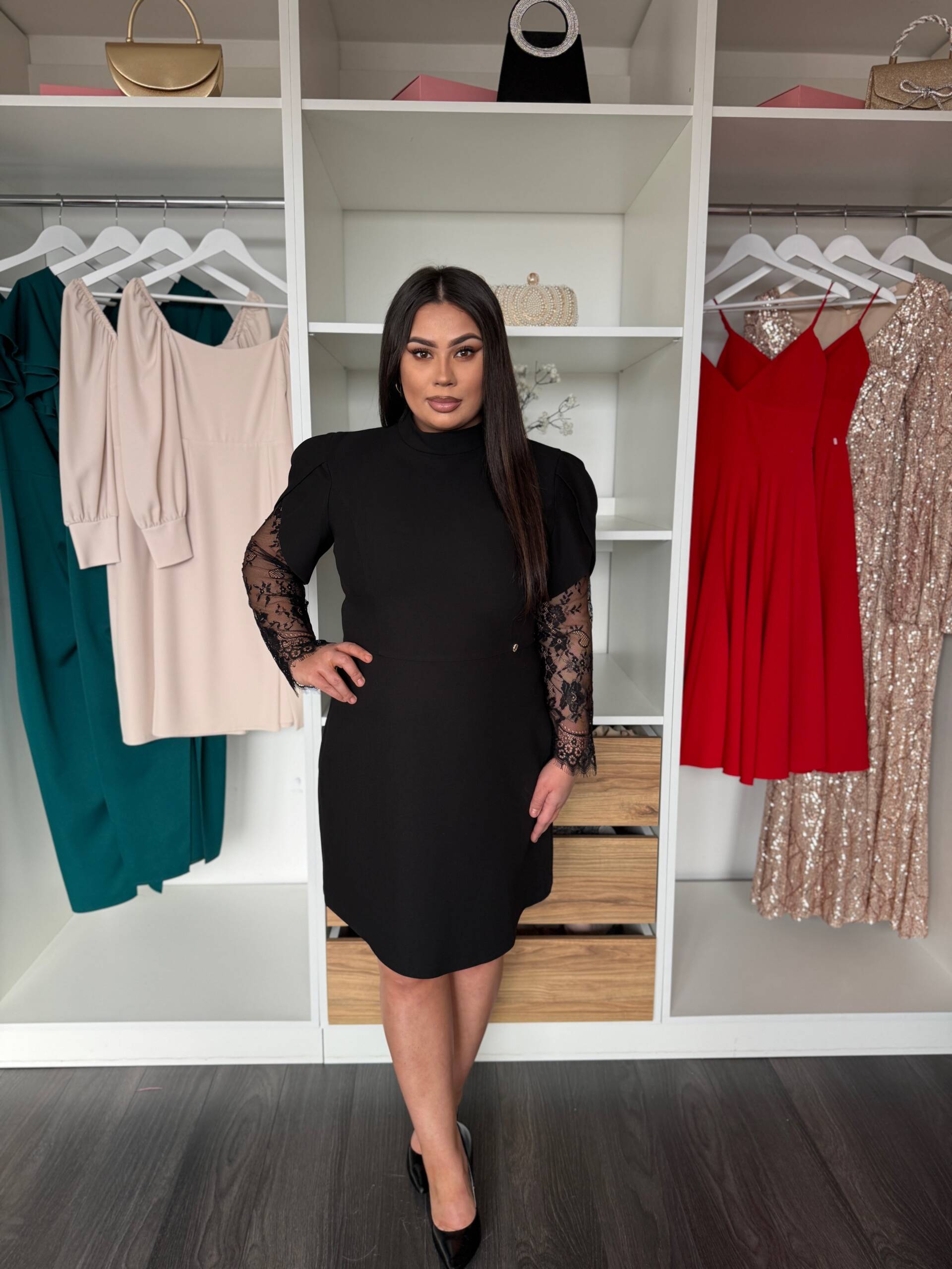Ponadczasowa czerń, kobiecy krój i subtelny, koronkowy detal. Ta sukienka to idealna propozycja dla kobiet, które cenią elegancję w nowoczesnym wydaniu.