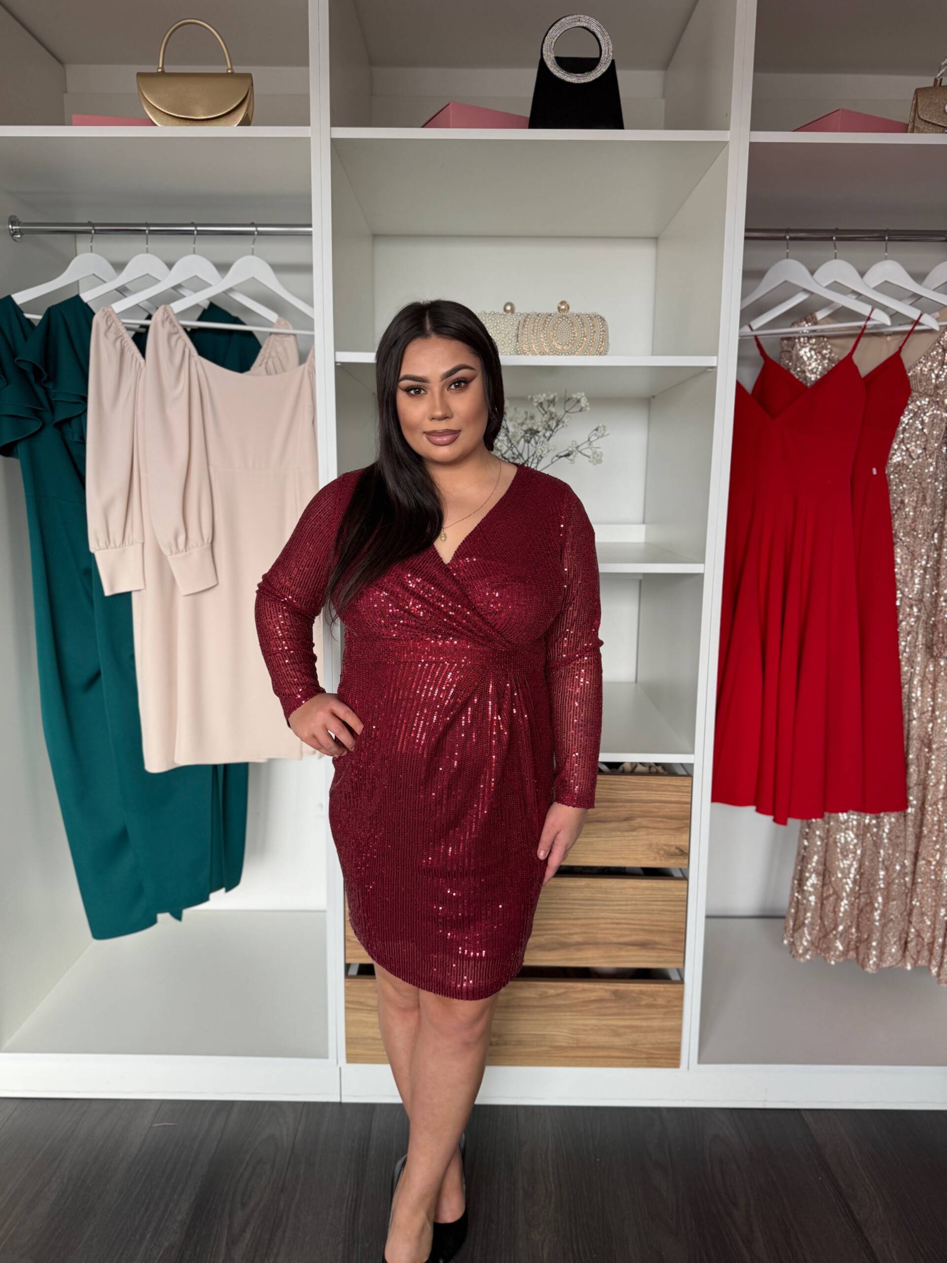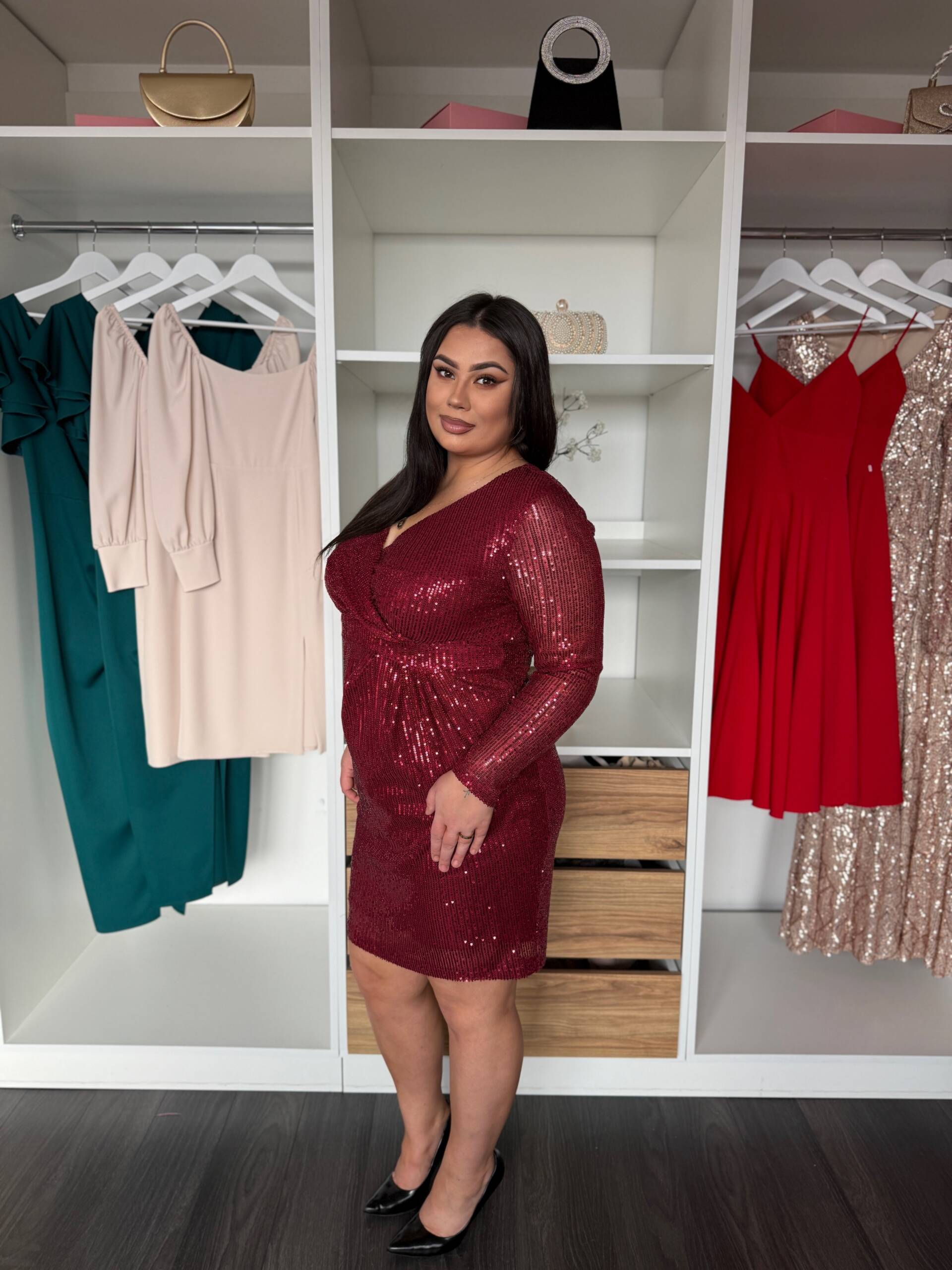 Fason miękko otula sylwetkę, podkreślając jej atuty i subtelnie maskując drobne niedoskonałości. To idealna propozycja na wieczorne wyjścia, przyjęcia i wyjątkowe okazje, podczas których liczy się elegancja, kobiecość i efektowny detal.