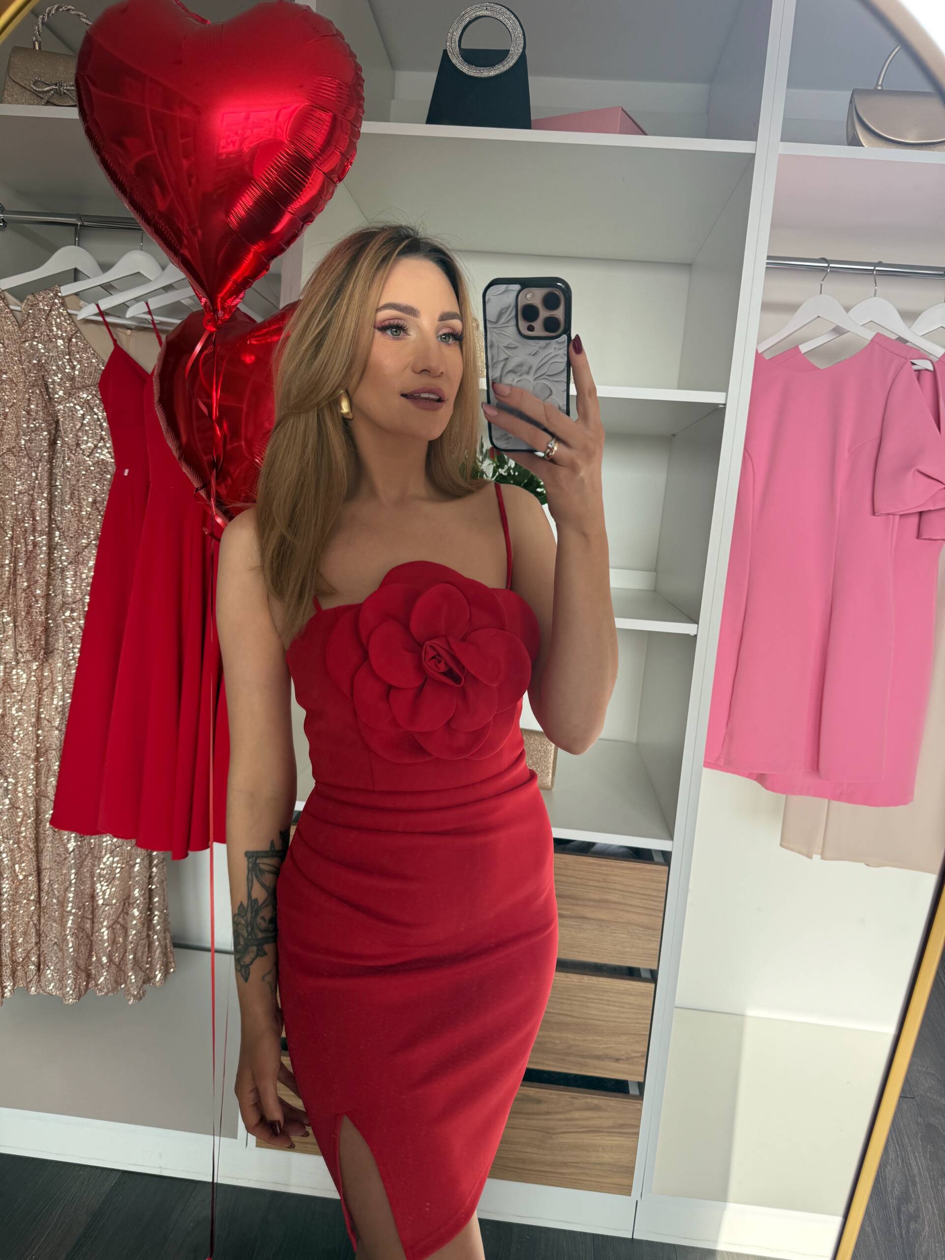 Największym atutem kreacji jest trójwymiarowa aplikacja w kształcie kwiatu na biuście – wyrazisty, modowy akcent, który nadaje stylizacji luksusowego i unikatowego charakteru. Cienkie ramiączka delikatnie eksponują ramiona i plecy, dodając lekkości oraz zmysłowości.